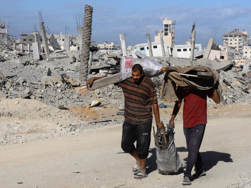 Palestinians walk past the rubble of destroyed buildings, amid a ceasefire between Israel and Hamas, in Gaza City, October 15, 2025. REUTERS/Ebrahim Hajjaj